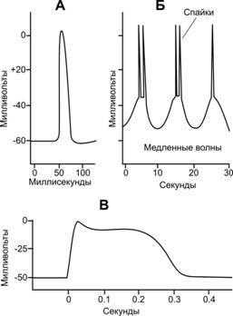Рис.7-20.Потенциалыдействиявгладкоймышце.А— ПД в гладкой мышце, вызванный внешним стимулом;Б— Повторные спайковые ПД, вызванные медленными ритмическими электрическими волнами, наблюдающимися в спонтанно сокращающейся гладкой мышце стенки кишечника;В— ПД с плато (ГМК миометрия).