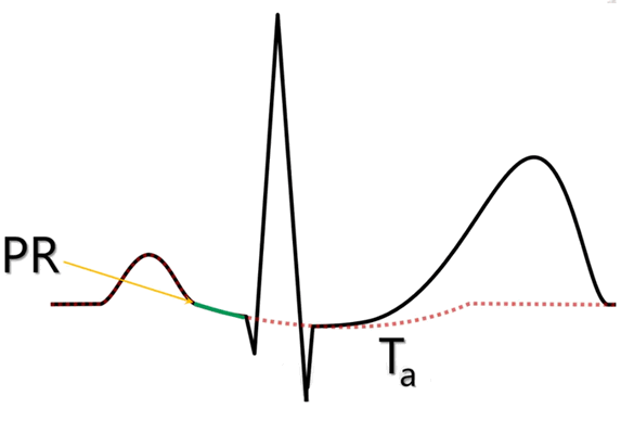 Волна реполяризации предсердий (обозначается Ta), наслаивается на комплекс QRS и, как правило, не видна на ЭКГ. Однако в некоторых случаях волна Ta становится заметной и смещает интервал PR, QRS и начальный участок ST.