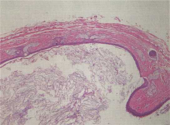 Рис. 10. Дермоидная киста, выстланная многослойным плоским эпителием с волосяными фолликулами (микропрепарат, окраска гематоксилином и эозином. Ув. 40).
