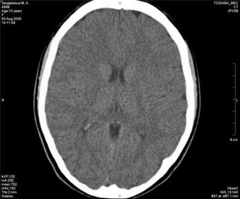 Общий, биохимический анализ крови и анализ мочи соответствуют возрастной норме. Педиатром патологии внутренних органов не выявлено. При КТ-исследовании головного мозга изменения очагового и диффузного характера отсутствуют, боковые желудочки мозга обычных размеров и конфигурации, асимметричны (D>S) в пределах нормы (рис. 5). Рисунок 5. Больная С., 15 лет. КТ головного мозга. На рентгенограммах грудного отдела позвоночника и костей таза патологических изменений не выявлено. МРТ пояснично-крестцового отдела также без патологии. Ортопедически подтверждается лишь эквино-варусная деформация правой стопы. Электронейромиографическое исследование патологии периферической нервной системы не зарегистрировало. Дуплексное исследование сосудов головы и шеи изменение кровотока не выявило.