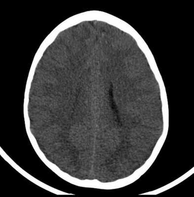 Рисунок 2 | 9-тилетний мальчик, переживший ДТП. КТ, сделанная в день травмы, показала несколько гиперденсных фокусов в левой лобной доле.