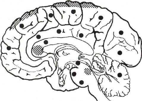 Рисунок 1 | Типичная локализация аксональных повреждений (чёрные кружки) и очагов геморрагии (заштрихованные участки) (К. Bostrom, C.G. Helander, 1986).