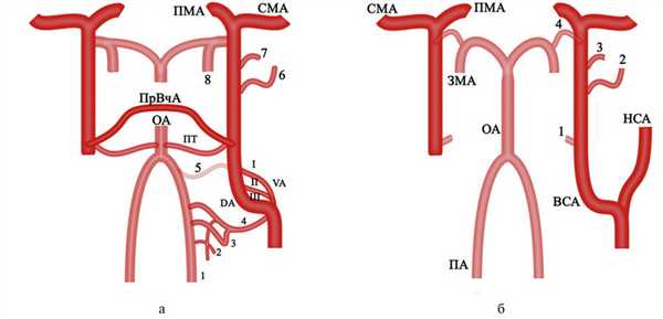 Связь артериальных бассейнов осуществляется посредством каротидно-базилярных анастомозов, к которым относятся: проатлантовая межсегментарная артерия (I и II типа), подъязычная, ушная и тройничная артерии, а также недавно описанная транскливальная артерия (которая может являться как отдельной формой каротидно-базилярного анастомоза, так и крайним вариантом подъязычной или проатлантовой межсегментарной (I типа) артерий [3—7]. Далее в ходе развития вертебробазилярного и каротидного бассейнов происходит регрессия эмбриональных артерий, что приводит к персистированию примитивных артерий, формирующих «незрелые» пути коллатерального кровотока между каротидным и вертебробазилярным бассейнами (рис. 2). Рис. 2. Этапы формирования артериального круга головного мозга. а — связь артериальных бассейнов посредством каротидно-базилярных анастомозов: 1 — продольные невральные дуги; 2 — проатлантовая межсегментарная артерия II типа; 3 — проатлантовая межсегментарная артерия I типа; 4 — примитивная подъязычная артерия (отходит одним стволом с проатлантовой межсегментарной артерией I типа); 5 — примитивная ушная артерия (существование ее оспаривается); 6 — дорсальная офтальмическая артерия; 7 — вентральная офтальмическая артерия; 8 — каудальная (задняя) ветвь ВСА; ОА — основная артерия; ПА — позвоночная артерия; ПМА — передняя мозговая артерия; ПТ — примитивная тройничная артерия; ПрВчА — примитивная верхнечелюстная артерия (межкавернозный анастомоз); СМА — средняя мозговая артерия; VA — вентральная аорта; DA — дорсальная аорта; I, II, III — артериальные дуги; б — регрессия эмбриональных артерий: 1 — задненижняя гипофизарная артерия (остаток ПрВчА); 2 — инфралатеральный ствол; 3 — глазничная артерия; 4 ЗСА — задняя соединительная артерия; ЗМА — задняя мозговая артерия; НСА — наружная сонная артерия; ОА — основная артерия; ПА — позвоночная артерия; ПМА — передняя мозговая артерия; СМА — средняя мозговая артерия.