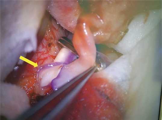 Операции проводились под общей анестезией. Первым этапом стандартным доступом выделялась бифуркация общей сонной артерии (ОСА). Параллельно производился забор лучевой артерии. Средняя длина шунта была 22,5 см. Диаметр в проксимальном отрезке составил от 2,5 до 3,4 мм, в дистальном отрезке - от 2,1 до 3,1 мм. После выполнения краниотомии выделялся М2 сегмент СМА, на него накладывались временные клипсы. Затем выполнялась продольная артериотомия М2 сегмента СМА, формировался дистальный анастомоз с дистальным отделом лучевой артерии по типу конец в бок (рис. 2). Клипсы с СМА снимались. Среднее время пережатия СМА составило от 35 до 44 мин. Шунт проводили в подкожном преаурикулярном тоннеле или под скуловой дугой в рану на шее.