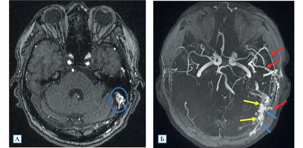 Примечание. А — сброс крови из ветвей наружной сонной артерии в левый поперечный синус; Б — аксиальная MIP-реконструкция: визуализируются нормальные артерии Виллизиева круга; слева расширенные и извитые ветви наружной сонной артерии (алые стрелки), из которых происходит сброс крови в поперечный и сигмовидный синусы (желтые стрелки), извитость и расширение дуральных вен вследствие полнокровия (голубые стрелки).