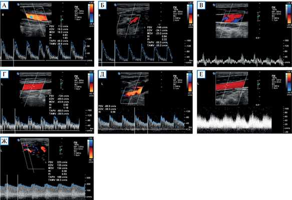 Примечание. Кровоток по общей сонной артерии (А) и наружной сонной артерии (Б) справа с нормальными индексами периферического сопротивления (PI и RI). Физиологический трехфазный кровоток по правой внутренней яремной вене (В). Кровоток по общей сонной артерии (Г) и наружной сонной артерии (Д) слева со сниженными индексами периферического сопротивления. Артериализация кровотока по левой внутренней яремной вене (Е). Значительно повышенный кровоток с низкими индексами периферического сопротивления по задней околоушной артерии (ветви наружной сонной артерии) в области артериовенозной мальформации (Ж).