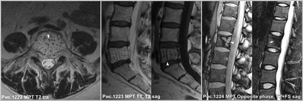 Крупная гемангиома в теле L5 позвонка, распространяющаяся на всё его тело, приводящая к перестройке губчатого вещества кости, с разряжением губчатого вещества и наличием вертикальных утолщенных костных балок (головки стрелок на рис.1222,1223). Гемангиома в теле позвонка, имеющая жировую интенсивность МР-сигнала - ↑сигнал по Т1, с обозначением контура на последовательности в противофазе (головка стрелки на рис.1224), и имеющая выпадение МР-сигнала в режиме Т2 с жироподавлением (стрелка на рис.1224), что соответствует жировой ткани в гемангиоме.