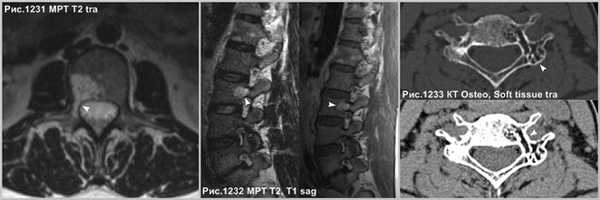 В случае нахождения гемангиомы в дужке или распространения с тела в дужку позвонка (головки стрелок на рис.1231-1233), важно указывать данный факт в связи с тем, что структура позвонка в указанном месте ослаблена и может послужить причиной патологического перелома в процессе медицинских манипуляций, так же важно учитывать этот факт нейрохирургам при транспедикулярной фиксации.