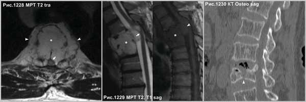 Осложнение в развитии гемангиом в виде экспансивного роста, что встречается не часто, когда опухоль (звёздочки на рис.1228,1229) распространяется за пределы тела позвонка (головки стрелок на рис.1228,1229), приводит к компрессии спинного мозга (стрелки на рис.1228, 1229). Серьёзное осложнение представляет собой патологический перелом тела позвонка (головки стрелки на рис.1230), структура которого была ослаблена разряжением губчатого вещества в процессе роста гемангиомы.