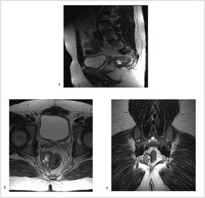 Рис. 3. МР-томограммы малого таза. Опухоль уменьшилась в размере до 5,5×3,5×4 см, однако тесно прилежит к правой стенке прямой кишки. а — аксиальный срез; б — сагиттальный срез; в — фронтальный срез.