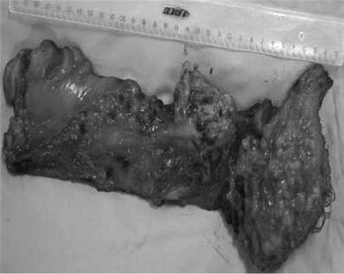 07.11.2012 выполнена цилиндрическая или экстралеваторная экстирпация прямой кишки. Через тазовую брюшину в мезоректальной клетчатке справа пальпируется верхний полюс опухоли, подрастающей к стенке прямой кишки, опухоль фиксирована к правой боковой стенке таза. Отдаленных метастазов нет (рис. 4).