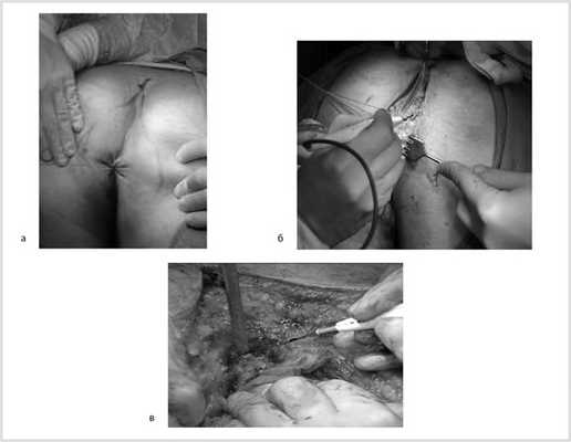 Рис. 8. Этапы операции. а — ушивание ануса; б — рассечение кожи и подкожной жировой клетчатки; в — пересечение крестцово-копчиковых связок.
