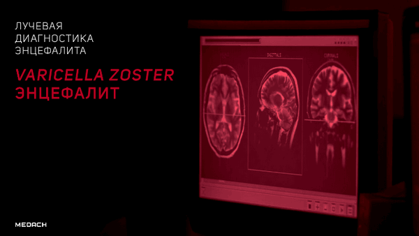 Лучевые проявления VZV-энцефалита крайне схожи с таковыми при ВПГ-энцефалите. Стоит напомнить, что установление этиологии заболевания по данным визуализации невозможно. Более характерными признаками VZV-инфекции можно назвать: