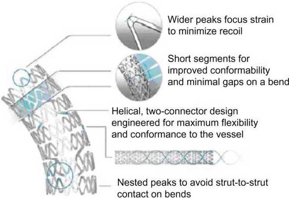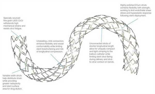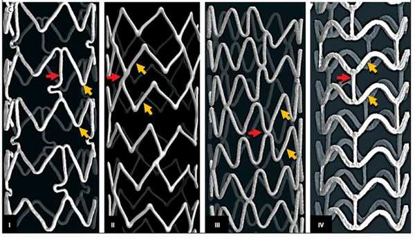 Исследование 1994 года не показало разницы между имплантацией такого стента и обычной ангиопластикой. Развитие этого направление позволило разработать новые типы стентов. Чаще всего они состоят из нескольких модулей, соединенных коннекторами. Изначально их производили из стали, однако сейчас в качестве материала для изготовления стентов используется платина, кобальт, нитинол (никель-титан), а также только титан. Из-за этого они стали существенно меньше и легче. РКИ выявили преимущества стентов с толстым каркасом перед таковыми с тонким. Предполагают, что они меньше травмируют сосуды, предотвращая таким образом реэндотелизацию.