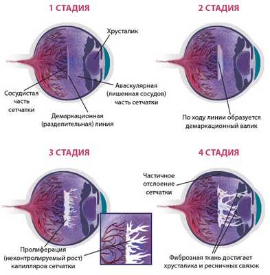 Отдельно выделяют «плюс-болезнь», у которой нет четких стадий. Такая форма развивается раньше и прогрессирует намного быстрее, что вызывает отслойку сетчатки и быстрое наступление терминальных стадий ретинопатии.