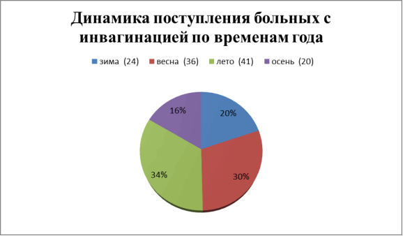 Инвагинация является самым частым видом острой кишечной непроходимости у детей, по нашим исследованиям наиболее часто встречаются в весенние и летние периоды в возрасте от 4 месяцев до 1 года.