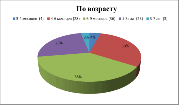 По результатам наших исследований в 91 (74, 7 %) случаев инвагинации кишечника встречался у детей в возрасте от 3 месяцев до 1 года.