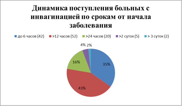 Под нашим наблюдением с 2011 по 2017 год находилось 386 детей с инвагинацией кишечника в возрасте от 4 месяцев до 7 лет. Пациенты проходили стационарное лечение в хирургическом отделении педиатрического корпуса Самарской областной клинической больницы им. В.Д. Середавина. Абсолютное большинство составили дети грудного возраста (224). Из 386 пациентов 251 ребенок поступил в первые сутки заболевания, 96 - на 2-е сутки, 33 - на 3-и, и 6 - на 4-е сутки от начала развития патологии. Кроме клинического обследования, применены ультразвуковое и рентгенологическое исследования. У 314 пациентов успешным оказалось консервативное лечение, у 72 выполнены хирургические вмешательства. 48 больных прооперированы с использованием лапароскопического доступа, 24 пациентам проведена дезинвагинация при лапаротомии. Одному ребенку с подвздошно-ободочной инвагинацией произведена резекция подвздошной кишки в связи с некрозом последней. В двух наблюдениях причиной инвагинации являлся Меккелев дивертикул, у остальных пациентов органических причин не выявлено. Все дети выписаны в удовлетворительном состоянии. Летальных исходов не наблюдалось. Из 386 пациентов у 15 больных отмечалось наличие рецидивирующей инвагинации после проведенного ранее консервативного расправления.