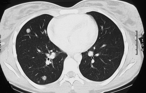 Множественные гематогенные вторичные узлы при раке почки, компьютерная томография (КТ).