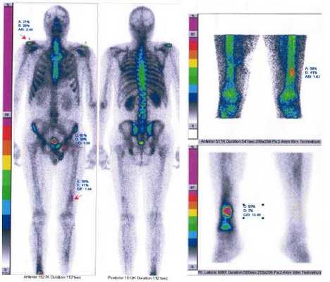Обследование было направленно на выявление первичного опухолевого очага и распространенности онкологического процесса. При поступлении специфические жалобы (кардиалгии, ощущение аритмии, головокружения, одышка, неустойчивость АД) отсутствовали. Гемодинамика была стабильная. В связи с подозрением на вторичный характер изменений L4 была выполнена остеосцинтиграфия с 99mTc-пирфотехом, подтвердившая высокую вероятность вторичного опухолевого поражения костей скелета (рис. 1). Вечером 27.11.2016 г. произошло резкое ухудшение состояние в виде быстрого нарастания явлений острой сердечной (левожелудочковой) и дыхательной недостаточности. Пациент был переведён на вспомогательную вентиляцию лёгких и инотропную поддержку сердечной деятельности. По данным выполненных по cito трансторакальной эхокардиографии (рис. 2) и КТ-ангиографии (рис. 3) органов грудной клетки было выявлено объёмное образование левого предсердия, практически полностью заполняющее собой его полость и обтурирующее левое атриовентрикулярное отверстие. По неотложным показаниям в первой клинике хирургии (усовершенствования врачей) ВМедА в условиях искусственного кровообращения было выполнено удаление новообразования левого предсердия (рис. 4). В послеоперационном периоде явления острой сердечной и дыхательной недостаточности регрессировали. При гистологическом исследовании удалённого новообразования левого предсердия были выявлены признаки злокачественной мезенхимальной опухоли. Иммуногистохимическое исследование фрагмента опухоли позволило установить окончательный диагноз - «Недифференцированная плеоморфная саркома левого предсердия с прорастанием в межпредсердную перегородку и правое предсердие. Метастатическое поражение костей скелета: Th12-S2 позвонков, левой подвздошной кости, правой плечевой, лобковой, бедренной, большеберцовой костей».