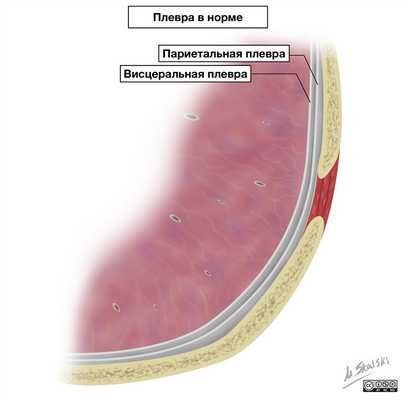 Плеврой (pleura) называют тонкую, гладкую, богатую эластичными волокнами серозную оболочку, которой покрыты легкие. Различают два вида плевры, одна из которых сростается с тканью легких, а другая с внутренней стороны устилает стенки грудной полости. Легочную плевру называют висцеральной, а ту, которая устилает стенки грудной полости — париетальной. Вокруг каждого легкого образуется герметически замкнутая плевральная полость, которая содержит небольшое количество плевральной жидкости. Эта жидкость, в свою очередь, способствует облегчению дыхательных движений легких. В норме плевральная полость заполнена 20-25 мл плеврозной жидкости.
