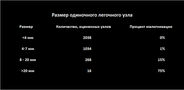 Swensen и соавт. изучали взаимосвязь между размером одиночного легочного узла и риском малигнизации у пациентом с высоким риском развития рака легкого (1).