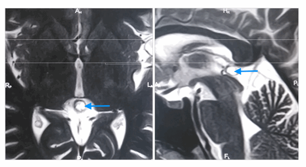 Киста шишковидной железы с типичным гиперинтенсивным сигналом на МРТ (Т2 ВИ) (отмечена синей стрелкой). Слева: аксиальная томограмма, справа - сагиттальная