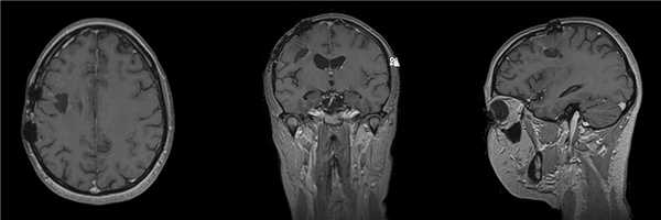 Пациентка 32 лет в течение месяца отмечает появления головной боли, сопровождающейся тошнотой и головокружением. Консультирована неврологом, направлена на МРТ, при которой выявлена внутримозговая опухоль правой заднелобной области, накапливающая контрастное вещество, с выраженным перифокальным отеком.
