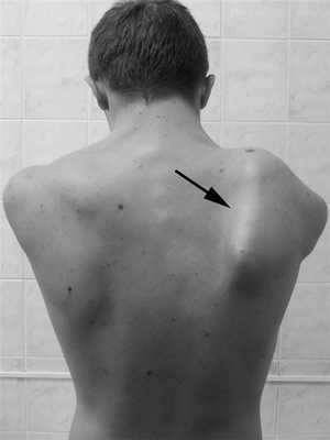 Рис. 1. Наличие симптома медиальной крыловидной лопатки (стрелка) у пациента с ШР.