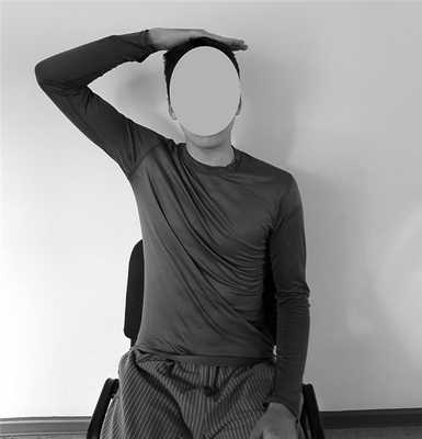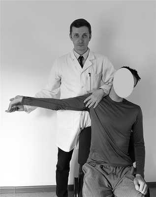 5. Симптом/тест отведения плеча: облегчение боли при отведении плеча (рис. 4), описываемое самим пациентом (обычно в период перед сном) или наблюдаемое во время неврологического осмотра в положении больного сидя после выполнения команды врача. Уменьшение боли в данном положении при ШР было описано R. Spurling еще в 1956 г., а в последующем диагностическая ценность теста была подтверждена в исследовании с использованием ЭМГ [19]. Облегчение боли в этом положении связывают с уменьшением натяжения спинномозговых корешков и декомпрессией эпидуральных вен [20]. Точность симптома/теста отведения плеча в верификации ШР в исследовании ШЕРПА составила 75,8% (95% ДИ: 68,5—82,1).