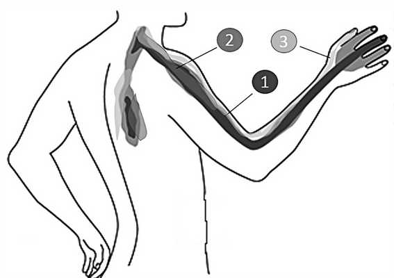 Рис. 3. Наиболее часто встречаемые паттерны болевых ощущений у пациентов с шейной радикулопатией: 1 — соответствует ирритации спинномозгового корешка CVII, 2 — CV и 3 — CVI.