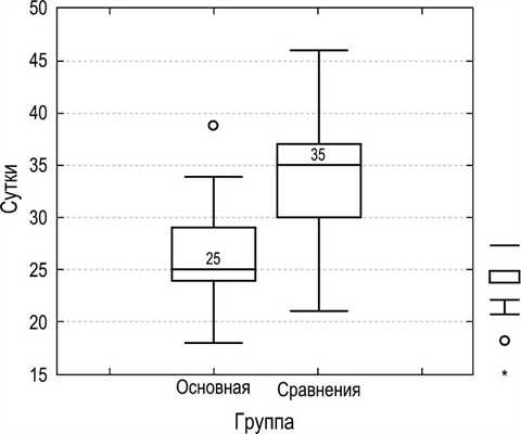 Длительность течения заболевания. Одной из важнейших конечных точек исследования была оценка периода нетрудоспособности, которая рассчитывалась как количество суток от начала заболевания до момента возвращения к привычной рабочей нагрузке. В основной группе больных этот показатель составил 25 [24; 29] сут, что оказалось значимо (p<0,05) меньше, чем в группе сравнения — 35 [30;37] сут (рис. 5).