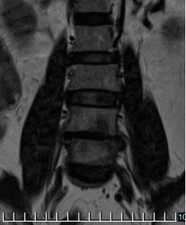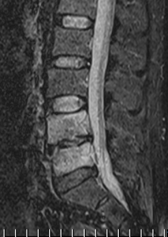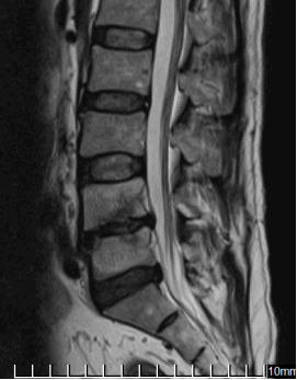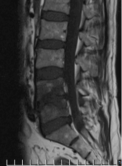Из анамнеза считает себя больным в течение 8 месяцев. Заболевание началось с болей в поясничном отделе позвоночника. Лечился консервативно с диагнозом: Остеохондроз поясничного отдела позвоночника. Грыжа межпозвонкового диска VL4-5 размером 6 мм. Вторичный стеноз позвоночного канала, радикулярный синдром, принимал НПВС, физиолечение, эпидуральные блокады глюкортикоидами, без эффекта. Общий анализ крови из сопроводительных документов: Нв-117 г/л; эрит-3,5; Цвет.пок.-0,9; лейкоц-5,5; Пал.яд.-1; Сег.яд-60; Эоз.-4; лимф.-34; Мон.-5; СОЭ-5 мм/ч. Через 3 недели неэффективной терапии произведена лазерная вапоризация межпозвонкового диска VL4-5 под местной анестезией, в послеоперационном периоде назначен цефазолин 1,0 в/м 2 раза в день в течение 10 дней. После проведенного вмешательства отмечалось клиническое улучшение. Однако уже через 2 месяца у больного стали отмечаться боли в поясничном отделе позвоночника, повышение температуры тела до 38 градусов, больному проведен курс антибиотикотерапии: антибиотиками широкого спектра действия и НПВС в течение 20 дней, температура нормализовалась и больной выписан на реабилитационное лечение. Спустя 2 месяца больной обращается к нам с вышеуказанными жалобами.