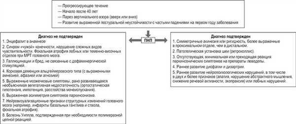 Клинические критерии диагностики ПНП были разработаны в 1996 г. (рис. 1) [7]. Согласно критериям, возможный диагноз ПНП требует либо паралича вертикального взора (вверх или вниз), либо замедления вертикальных саккад в сочетании с выраженной постуральной неустойчивостью и частыми падениями, развивающимися на первом году. Вероятный диагноз ПНП требует сочетания паралича вертикального взора и выраженной постуральной неустойчивости. Достоверный диагноз ПНП требует наличия клинически возможного или вероятного ПНП и гистологических изменений, типичных для ПНП.