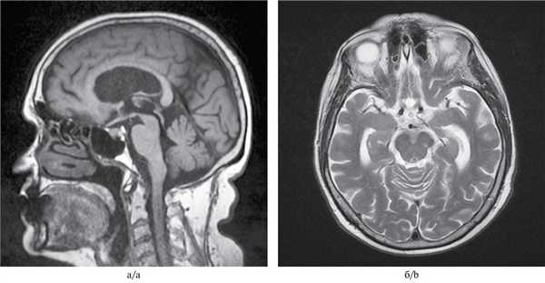 МРТ-исследование проведено на магнитно-резонансном томографе «Siemens» с напряженностью магнитного поля 1,5 Тл, с получением стандартных Т1- и Т2-взвешенных изображений (Т1-ВИ, Т2-ВИ) в фронтальной, аксиальной и сагиттальной плоскостях, с последующей оценкой визуальных изменений головного мозга (см. рисунок). Выявлены признаки атрофии среднего мозга с симптомами колибри в сагиттальной (см. рисунок, а) и Микки Мауса в аксиальной плоскостях (см. рисунок, б).