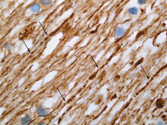 Отростки нейронов неравномерной толщины, с неровными контурами, утолщениями и участками фрагментарного уплотнения нейрофиламентов. Целостность отростков нейронов сохранена (указано стрелками). ИГХ с антителами к нейрофиламентам. Ув. 1000.