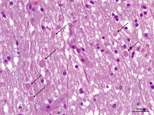 2. Аксотомия образуется вследствие прогрессирующих посттравматических изменений, приводящих к разрыву отростков нейронов. Установлено, что аксотомия появляется не ранее чем через 2 сут после травмы. Образующиеся при этом ретракционные шары визуализируются при рутинной гистологической окраске гематоксилином и эозином без применения специальных методов гистологического исследования (рис. 2 на цв. вклейке).