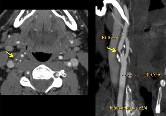 Как выглядит атеросклероз на КТ? Ангиография выявляет сужение правой внутренней сонной артерии атеросклеротической бляшкой. Исследование также позволяет наиболее точно изменить степень сужения сосуда (процент стеноза по методикам ESCT или NASCET). Ангиографию обязательно делать людям с выявленной патологией сосудов на УЗДГ, а также пациентам с повторяющимися инсультами.
