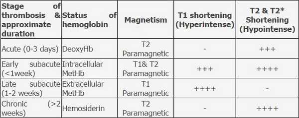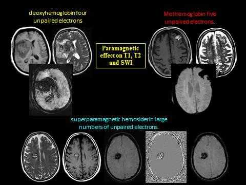 - В подострой стадии кровоизлияния, SWI использует парамагнитные свойства метгемоглобина. Атом железа в состоянии окисления содержит пять неспаренных электронов.