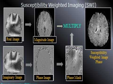Изображения взвешенные по восприимчивости (SWI) представляет собой 3D, flow-compensated, radiofrequency spoiled gradient-recalled echo последовательность, которая использует различия восприимчивости между тканями. Для выявления этих различий SWI сочетают магнитудные и фазовые изображения (рис. 1).
