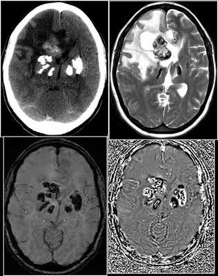 Пациенты с микрокровоизлияними были значительно старше и имели более высокую частоту гипертензии. Также наблюдалась сильная корреляция между гиперинтенсивными изменениями в белом веществе и количеством микрокровоизлияний. Гипертония является установленной причиной болезни мелких сосудов и обширные гиперинтенсивные изменения в белом веществе, как сообщалось, представляют собой связанные с микроангиопатией повреждения тканей. Эти микрокровоизлияния наиболее часто расположены в чечевицеобразных ядрах, таламусах и кортикально-субкортикальных областях, где обычно наблюдаются симптоматические гематомы ( рис. 4 )