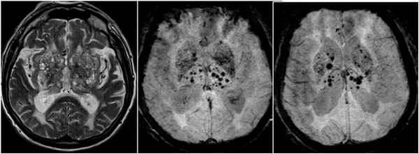 Церебральная амилоидная ангиопатия (САА) характеризуется наличием гомогенных эозинофильных отложений в кортикальных и менингеальных сосудах, что приводит к люминальным стенозам и фибриноидному некрозу. Это делает сосуды хрупкими и увеличивает тенденцию к кровотечению. Церебральная амилоидная ангиопатия не имеет корреляции с гипертонией, сахарным диабетом или атеросклерозом. При визуализации может быть представлена поверхностными лобарными гематомами, обычно с субкортикальным или субарахноидальным распространением. Фокальное или пятнистое / сливное поражение белого вещества (70%), и/или негеморрагическая диффузная энцефалопатия. GRE и T2 могут показать мультифокальные мелкие темные включения ( рис. 5 ).