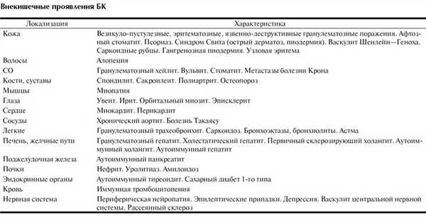К аутоиммунным относятся артриты, васкулиты, аутоиммунный гепатит, эписклерит, афтозный стоматит, узловая эритема, гангренозная пиодермия. Генетически детерминированные нарушения, связанные с HLA-B27, вызывают анкилозирующий спондилит и сакроилеит, увеит, первичный склерозирующий холангит. Внекишечные проявления, обусловленные мальабсорбцией (остеопороз, мочекаменная и желчнокаменная болезни, анемия, нарушения свертывания крови, тромбозы и др.), энтеропатией с потерей белка и/или амилоидозом (гипопротеинемия, гипоальбуминемия, отеки) появляются у большинства больных еюнитом и илеитом Крона. Внекишечные манифестации и аутоиммунные нарушения, возникающие при БК, в разное время описаны в литературе (см. таблицу).