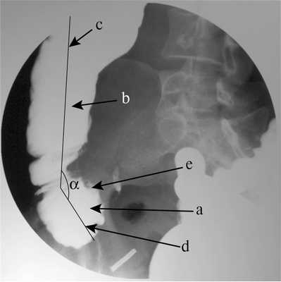При ирригоскопии выявлена деформация слепой кишки и «изъеденность» ее медиального контура (рис. 2). Рис. 2. Больная Ч., 34 года. Ирригограмма илеоцекального перехода и восходящей ободочной кишки. а — слепая кишка; b — восходящая ободочная кишка; с — ось восходящей ободочной кишки; d — ось слепой кишки; e — изъеденность медиального контура слепой кишки; α — угол между осями восходящей ободочной и слепой кишки. Слепая кишка отклонена медиально, образуя угол 39° по отношению к восходящей ободочной кишке.
