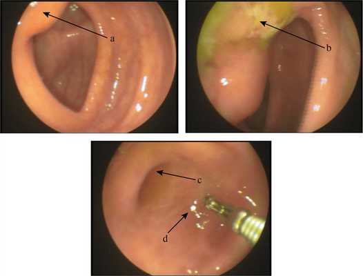 Колоноскопия. При осмотре перианальной области изменений не отмечено. Геморроидальные узлы не увеличены. При пальцевом исследовании прямой кишки болей и патологических образований не выявлено. Тонус сфинктера сохранен. Толстая кишка осмотрена, включая купол слепой кишки. При осмотре со стороны восходящей ободочной кишки особенностей области баугиниевой заслонки не замечено, она имела уплощенную форму (рис. 1). Рис. 1. Больная Ч., 34 года. Колоноскопия. Эндофото. Изменения илеоцекальной области. а — баугиниева заслонка; b — язва; с — устье аппендикулярного отростка; d — купол слепой кишки. Слепая кишка отклонена медиально и деформирована, из-за чего ее форму определить затруднительно. По этой же причине не удалось провести фронтальный осмотр баугиниевой заслонки, но на участке нижней губы баугиниевой заслонки, обращенном к отверстию, выявлена язва (см. рис. 1) средней глубины, неправильной формы, с невыраженным воспалительным валом, ровным дном и налетом серого фибрина. Размеры язвы не определены из-за деформации этой области. Отмечалась повышенная плотность стенки этой области при инструментальной пальпации, перистальтика отсутствовала. Проведение колоноскопа диаметром 1,2 см через отверстие баугиниевой заслонки оказалось невозможным из-за его сужения. Произведен забор фрагментов слизистой оболочки с краев и дна язвы для гистологического и цитологического исследования. Область купола слепой кишки и устья аппендикулярного отростка — без особенностей (см. рис. 1).