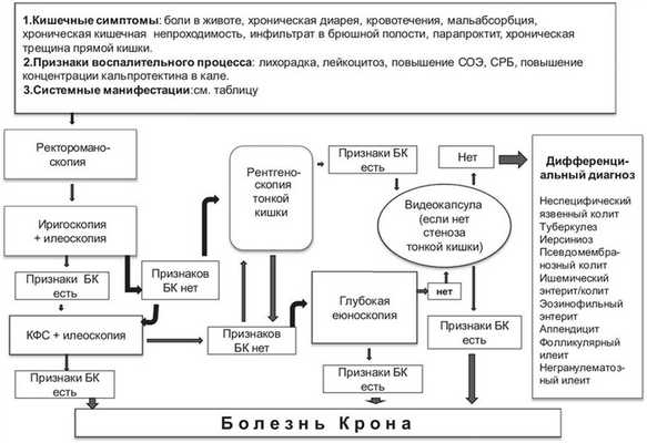 Диагноз болезни Крона можно заподозрить при наличии у пациента хотя бы одного признака из раздела, А (клинические проявления заболевания) и одного признака из любого другого раздела (внекишечные проявления заболевания).