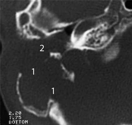 Главными отличительными признаками костной деструкции опухолевого генеза являются беспорядочность и широкая распространенность (рис. 4). Рисунок 4. Лангергансоклеточный гистиоцитоз. Аксиальная проекция правой височной кости. Распространенные беспорядочные деструктивные изменения остеолитического характера (1) в пирамиде и сосцевидном отростке. Мягкотканное образование (2) выполняет барабанную полость, обтурирует наружный слуховой проход. Участки костной деструкции могут быть выявлены на КТ в сосцевидном отростке, наружном слуховом проходе, в стенках барабанной полости и антрума, в капсуле лабиринта, в пирамиде височной кости и за ее пределами в костях основания и свода черепа [2, 4, 5]. Чем раньше обследуется ребенок с опухолью среднего уха, тем менее распространена деструкция в височной кости. Самые ранние стадии опухолевого процесса характеризуются ее отсутствием, что крайне затрудняет установление диагноза.