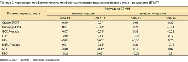 Таблица 2. Корреляция морфометрических, морфофункциональных параметров правого глаза и результатов ДТ МРТ Примечание. * — р