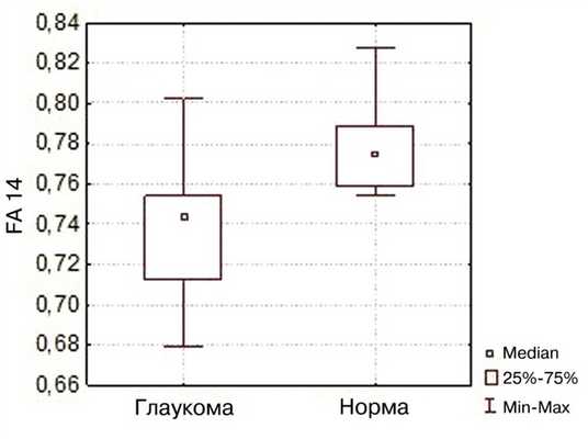 При статистической обработке полученных данных было выявлено достоверное снижение ФА в нижнем срезе (ФA 14) у пациентов с глаукомой по сравнению с аналогичным показателем в группе контроля (медианы значений 0,74 и 0,77 соответственно, р