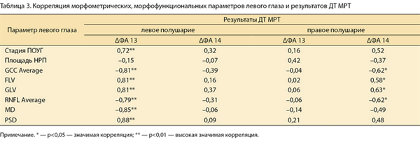 Таблица 3. Корреляция морфометрических, морфофункциональных параметров левого глаза и результатов ДТ МРТ Примечание. * — р